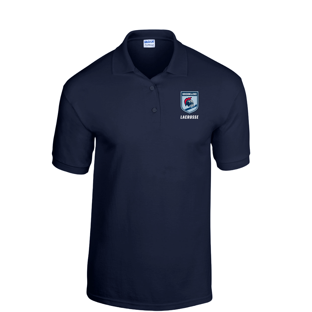 Our Brookline Lacrosse x Unit 1 Athletics Remixed logo Shield Polo. Materials: 6 oz., 50% USA cotton, 50% polyester, DryBlend® fabric wicks moisture away from the body, Made with 50% sustainably and fairly grown USA cotton and printed with the Brookline Lacrosse x Unit 1 Athletics logo. Features: Welt-knit collar and cuffs, Double-needle stitched hemmed bottom, Three-button placket